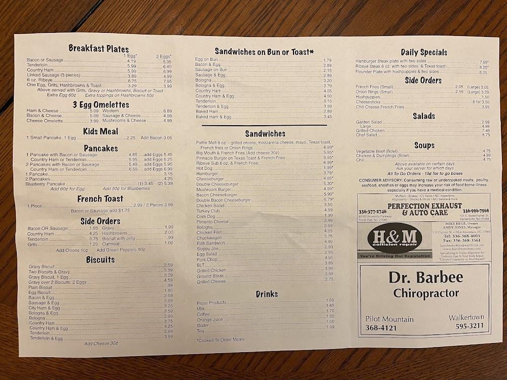 Welcome to Trails End Grill, your cozy dining spot in Pinnacle, NC! Open for breakfast, lunch, and dinner throughout the week, we serve up a delectable range of dishes, including our renowned hand-pattied burgers, mouthwatering hot dogs, daily specials, subs, BBQ, and sandwiches, all cooked fresh to order. Whether you're a regular or just passing through, our friendly atmosphere makes everyone feel at home. Join us for a meal, and you're sure to leave with a full belly and new friends. Swing by for a taste of local favorites—everyone is welcome at Trails End Grill!